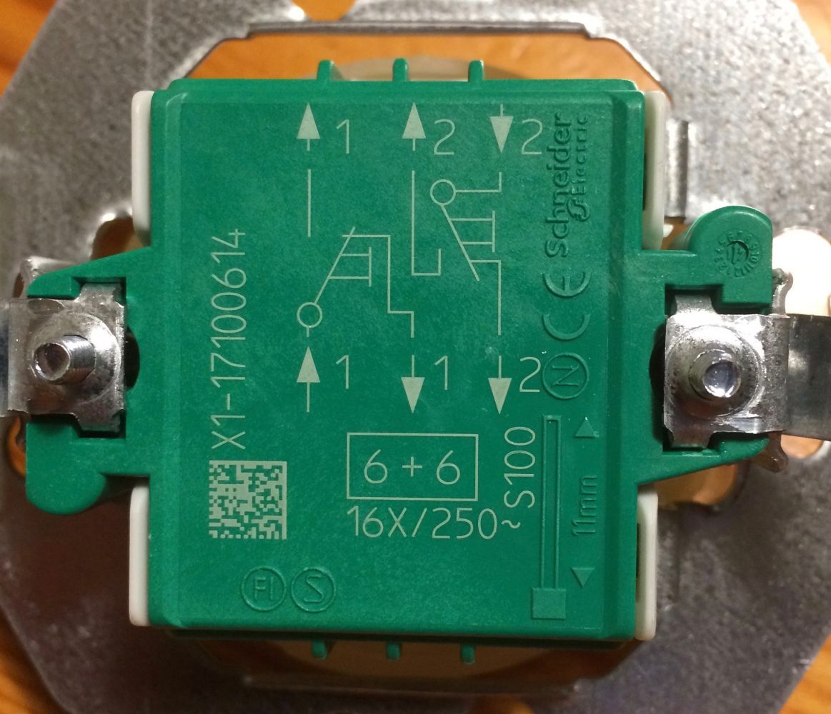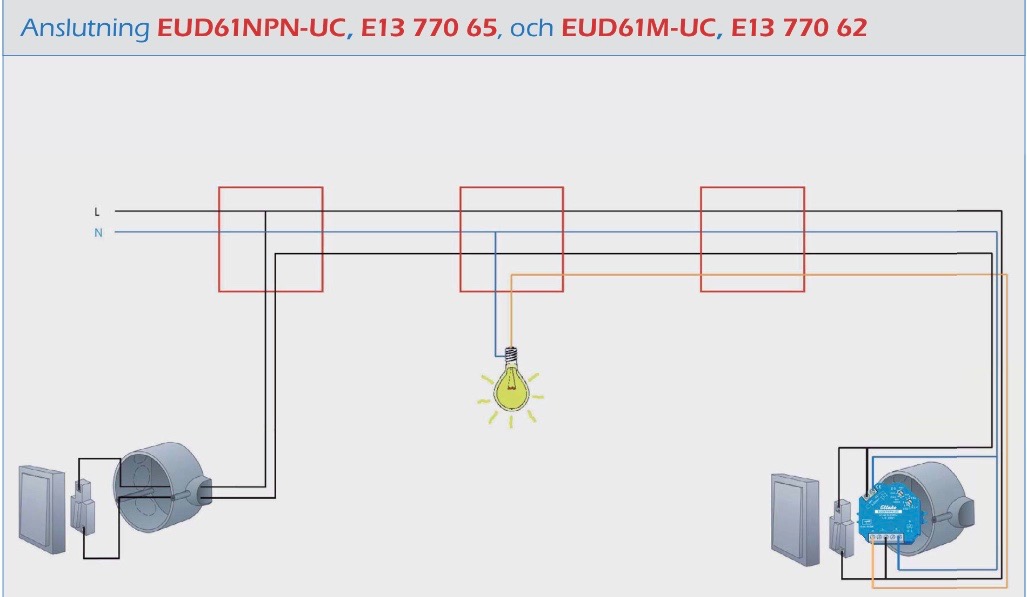 Brytaren kan du koppla fas på 1 pil in, dra en tråd mellan 1 pil ut (rakt ovanför 1 pil in) och +A1 på dimmern. Sätt en fjäder på brytarens 1-vippa. Du kan ha hur många brytare som helst till samma puck.