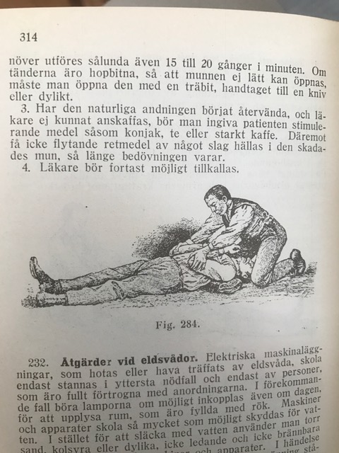 I min bok från 1910 står det inget om konjak eller starkt kaffe. Utvecklingen av första hjälpen gick fort till det bättre