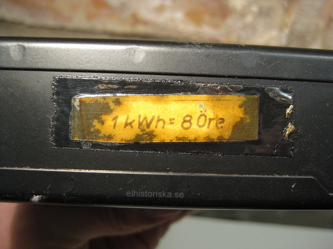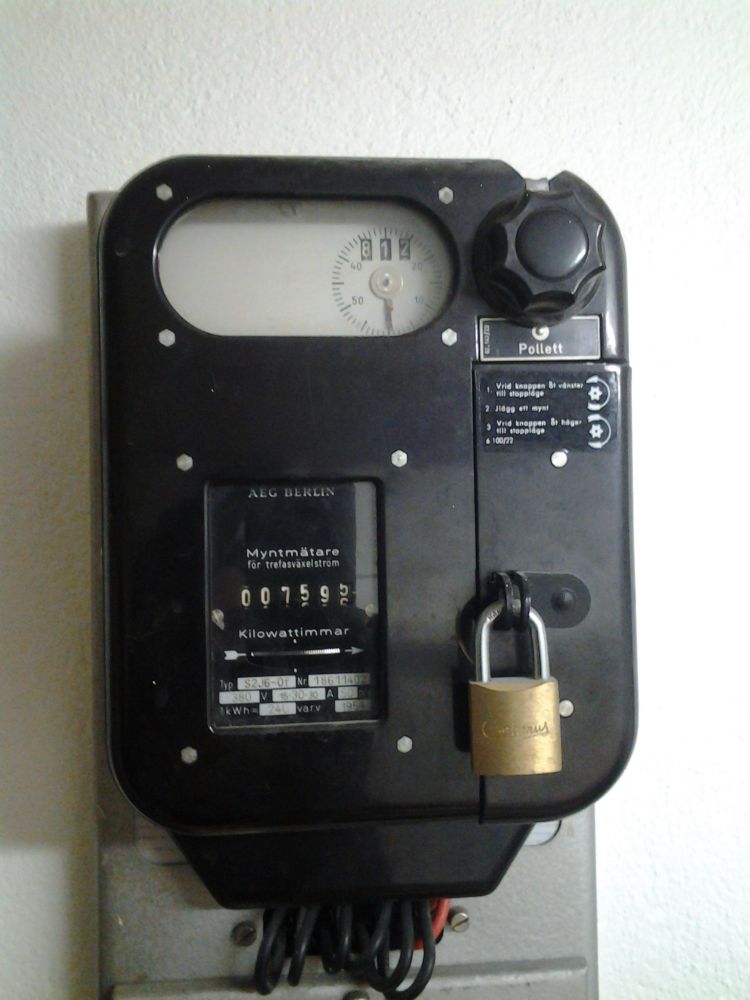 Inuti myntboxen finns en skylt med årets kWh-pris, 8 öre (omräknat till dagens blir väl ung. 1 krona). Senaste justeringen 1957.