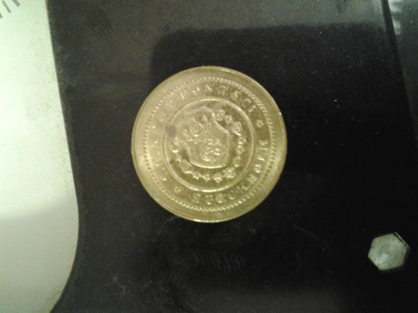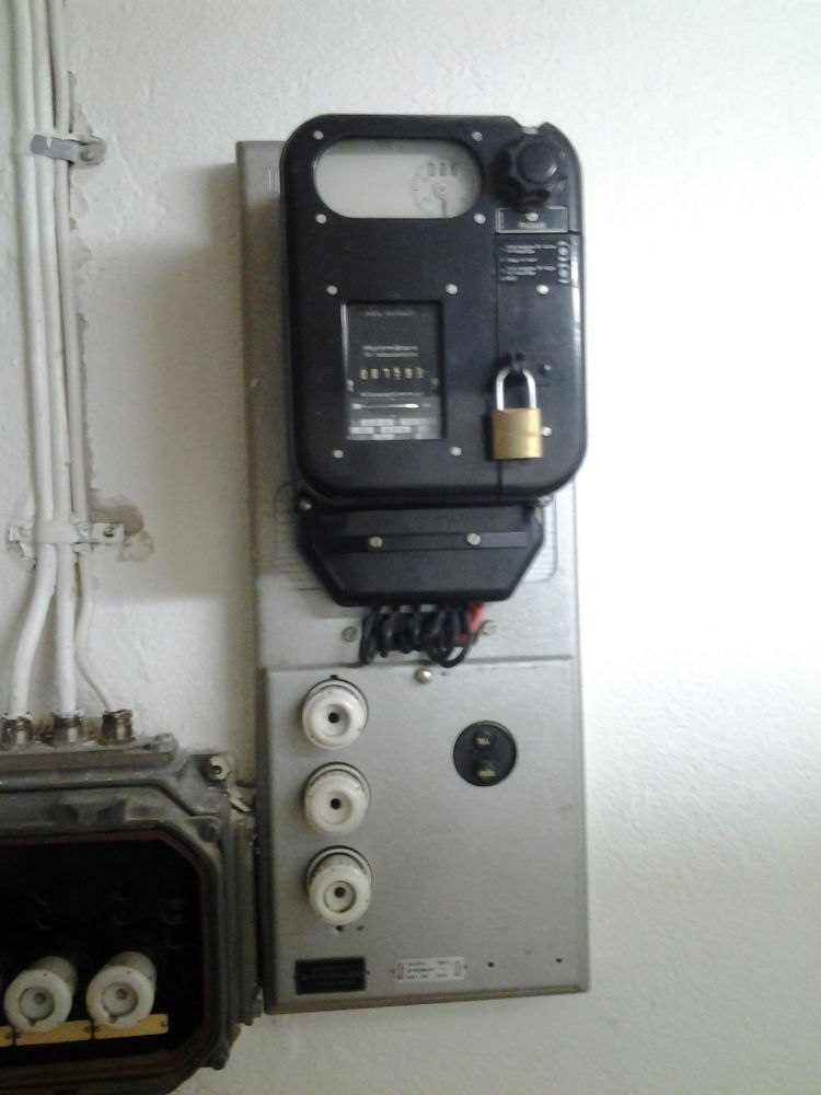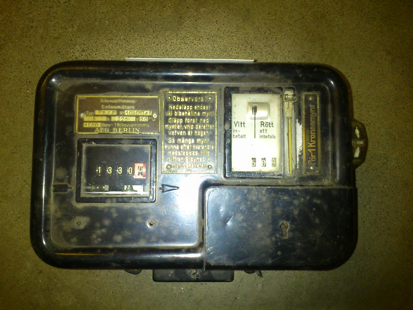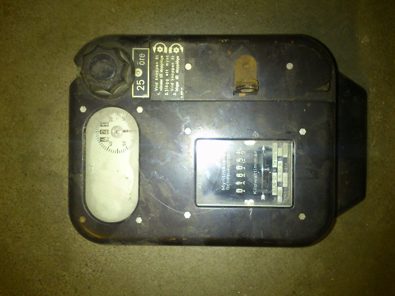 Var i ett flerbostadshus ifrån 50-talet idag och felsökte en säkring som löste hela tiden plus att inga pumpmotorer fungerade och att belysningen gick på halvfart. När det var färdigt så hittade vi (jag, en praktikant och styrelseordförande, hyresvärd eller något sånt.) en central i ett mangelrum. Där satt det en gammal, urkopplad myntmätare på väggen som jag fick plocka ner om jag ville ha den, och givetvis ville jag det! Så nu ligger den på köksbordet.