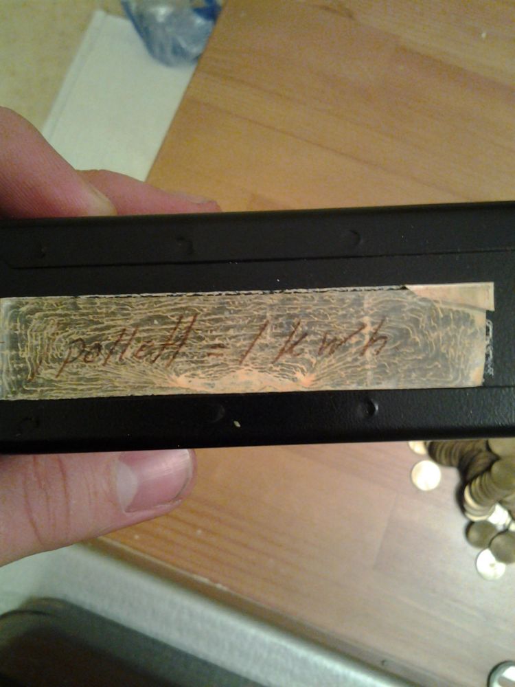 Här har vi lappen som hade lossnat, men tidigare suttit på sidan av behållaren. "1 pollett = 1 kWh"
