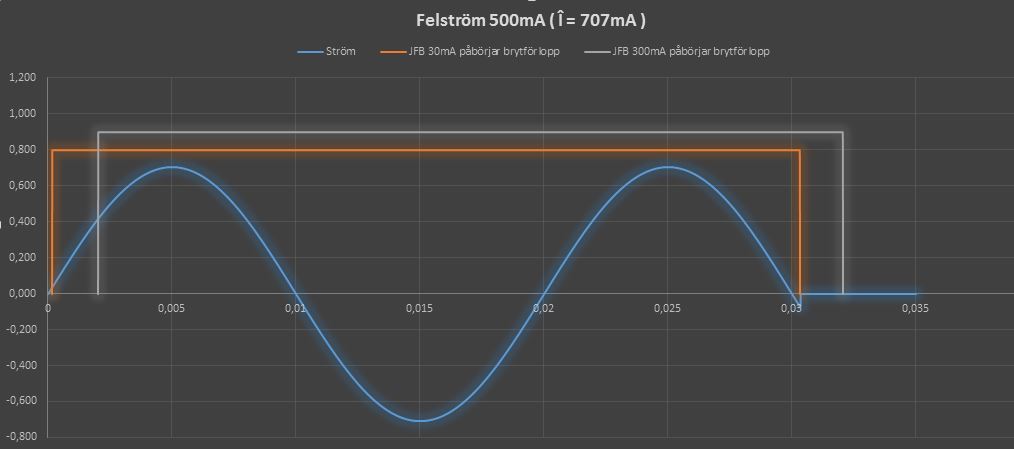 Borde inte en jordfelsbrytare lösa på momentanvärde snarare än effektivvärde? Alltså In 30mA borde översättas till in 42mA. Någon som vet hur många perioder som krävs för att jordfelsbrytaren ska lösa? Utlösning sker väl normalt inom 0,1-0,02 sekunder, men detta innefattar även den mekaniska rörelsen. Hur lång är den verkliga reaktionstiden? Jordfelsbrytaren borde i mitt tycke reagera på första momentana värdet som överstiger dess gräns för utlösning, alltså redan inom första perioden då. Om så är fallet och ett momentant värde på strömmen överstiger båda värdena så kan det vara så att båda löser även om de olika jordfelsbrytarna har olika In. Jag har försökt göra ett diagram som ska illustrera min tanke.