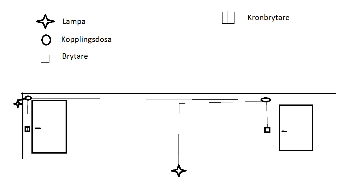 Brytare till höger är en vanlig enkel knapp bara, medans den till vänster är en kron, den ska tända och släcka ute lampan (längst till vänster) samt den lampan i taket som den andra enkel knappen också ska styra?