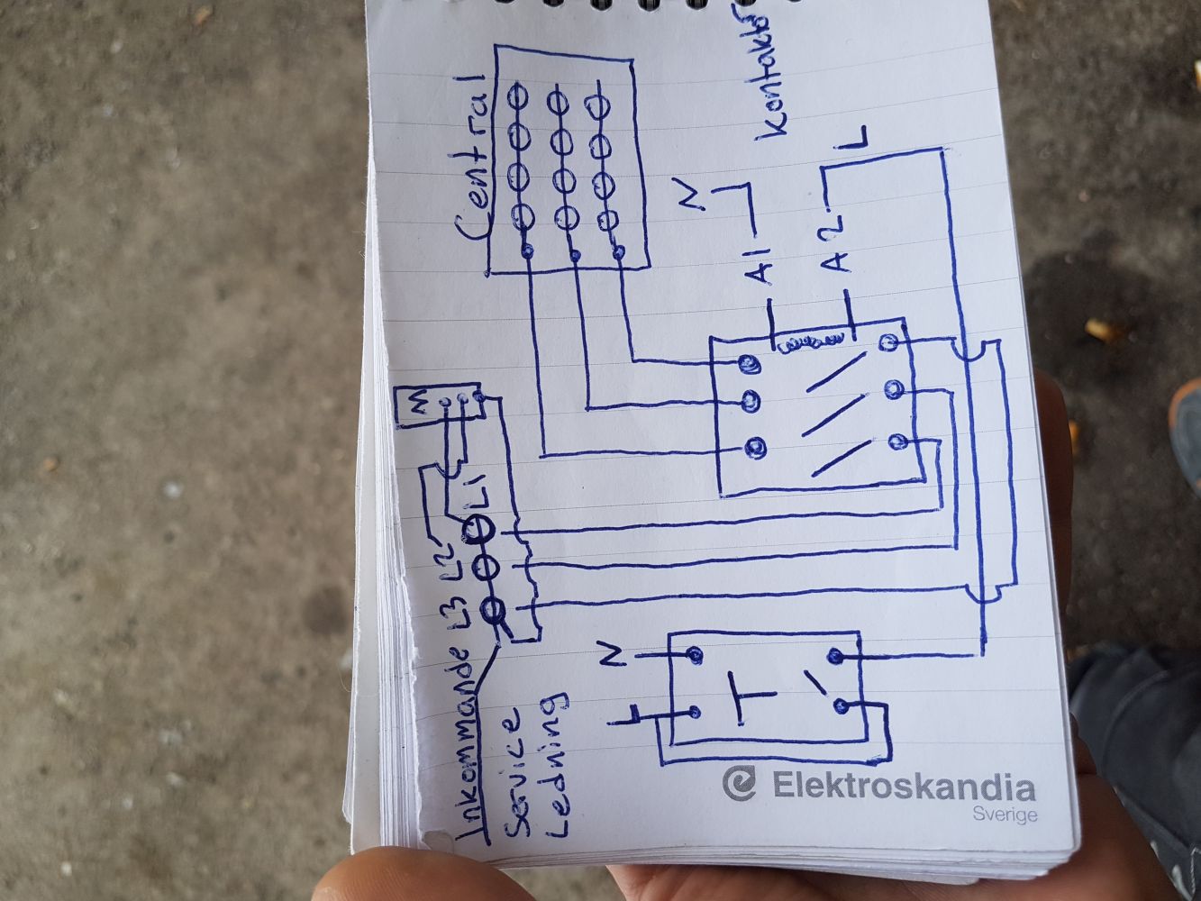 Kopplingens ska börja ifrån inkommande serviceledning via ett astrour som ska slå till en kontaktor som i sin tur ska ge en under central spänning som består av 8 grupper.