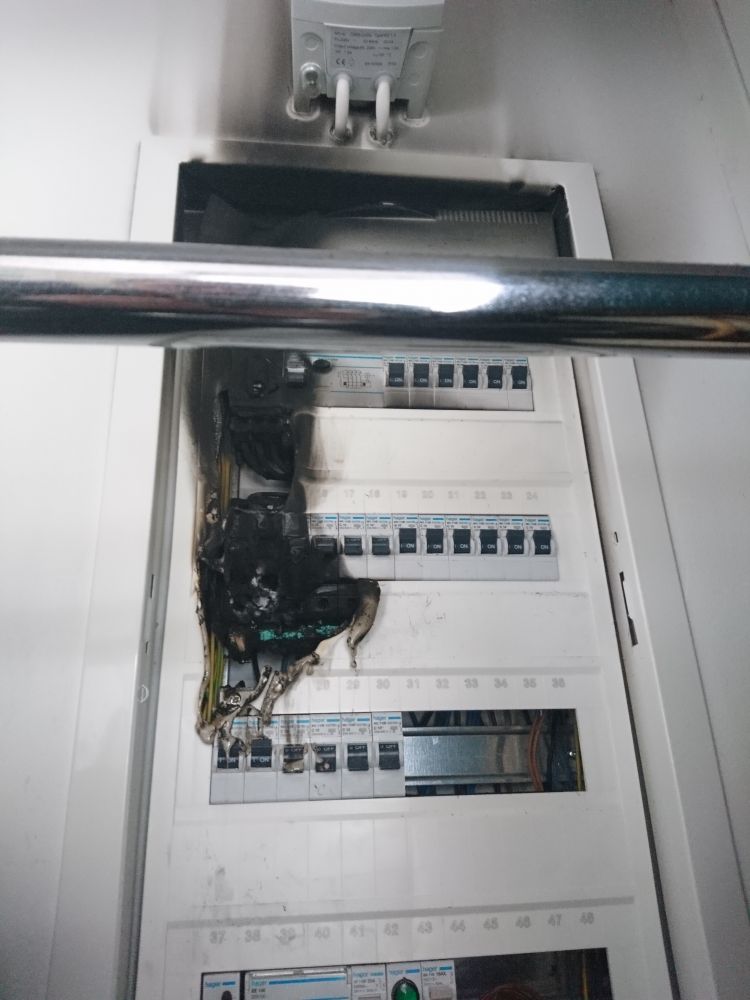 Talar också för överslag i fas-skenan, belastningen har legat direkt mellan faserna och utvecklat värme på plats, hade blivit samma sak med alla utgående grupper avslagna.