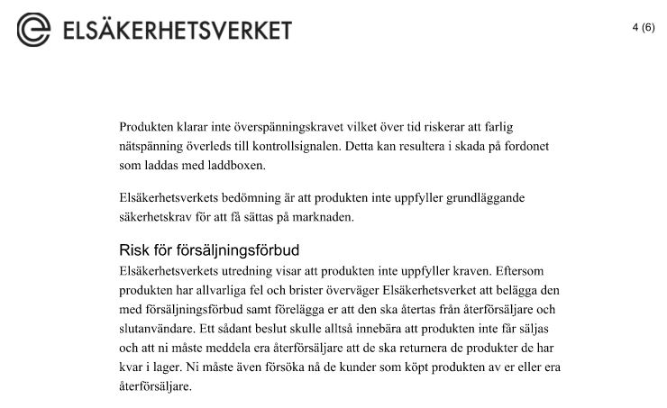Bifogar hela underrättelsen som skickats från Elsäkerhetsverket till Easee 2023-01-27 (Diarienr 22EV1261-19) Se PDF nedan.
