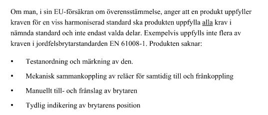 Men har man skrivit i dokumentationen att det finns en jordfelsbrytare som uppfyller villkoren i standarden för jordfelsbrytare och det inte finns någon jordfelsbrytare i utrustningen så ligger man nog risigt till.