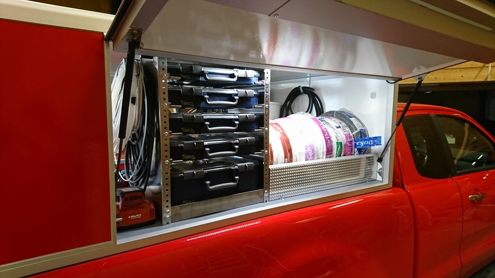 Då den stora frågan, får du inte problem med kondens och fukt i prylarna i skåpet?? För tio år sedan körde jag VW Taro åt Banverket Produktion, sedermera InfraNord och vi hade problem med rostande verktyg och fukt. Å andra sidan var skåpet rena skämtet jämfört det du visar....