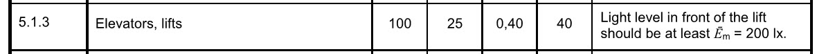 Är det nån här som har koll på hur många lux man måste ha (om det finns ett krav) utanför hissdörren på varje plan i flerbostadshus.
