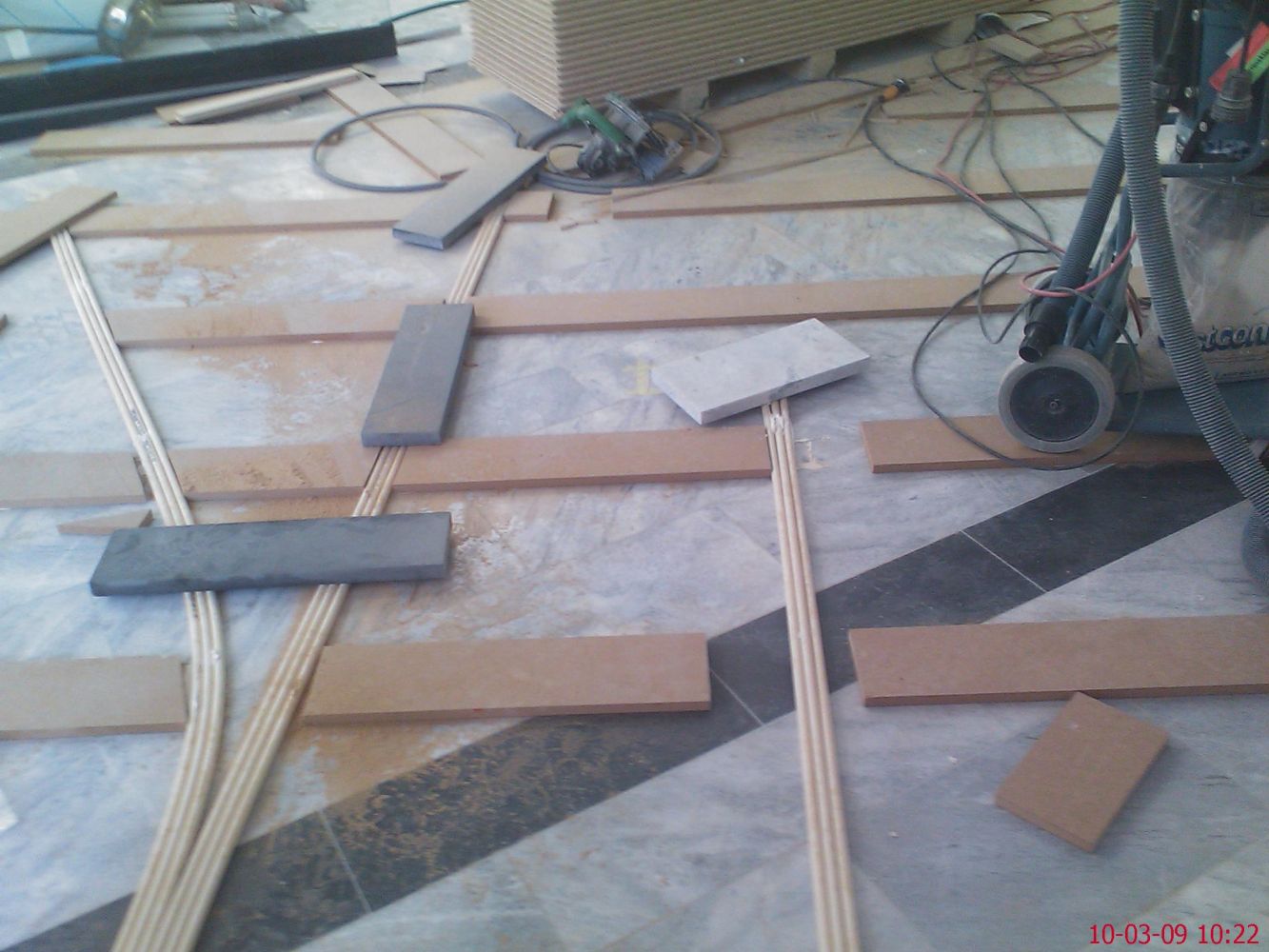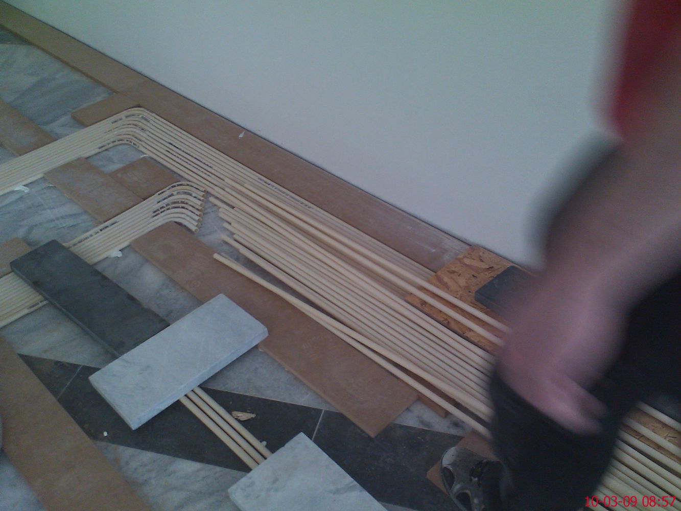 Jag skulle nog ha gått diagonalt tvärs över golvet med så få böjar som möjligt (om jag fick för snickaren/golvläggaren )