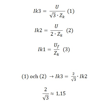 Detta säger mig att det vanligaste, om vi har samma impedans i returledaren, är att Ik3 borde vara 2 * Ik1. Om vi inte har samma impedans i returledaren som i fasledaren så borde Ik1 vara mindre helt enkelt. Det borde ge det generella sambandet Ik3 ≥ 2 * Ik1.
