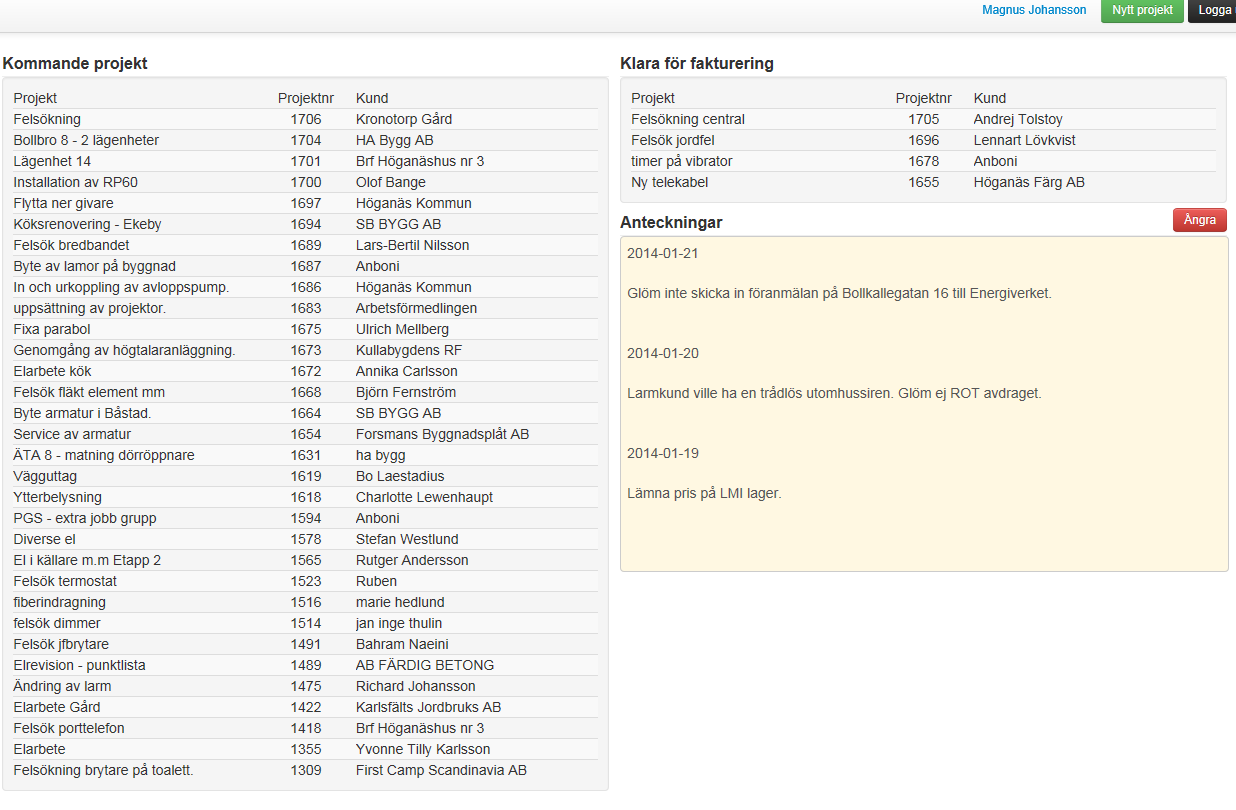 - Notering under varje projekt