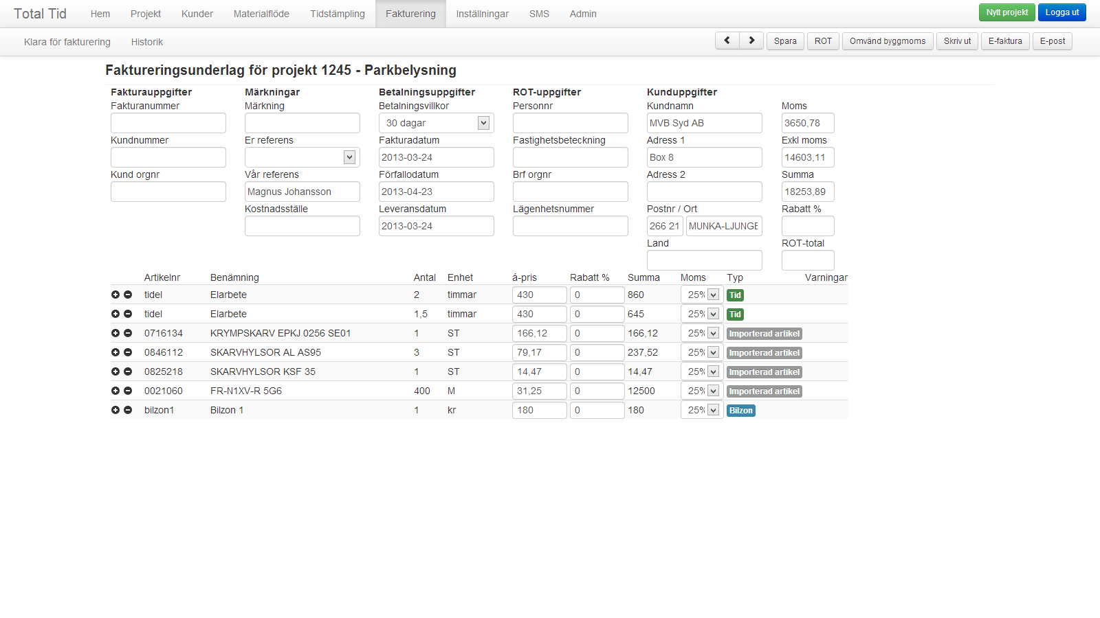 - Tid och materialrapportering