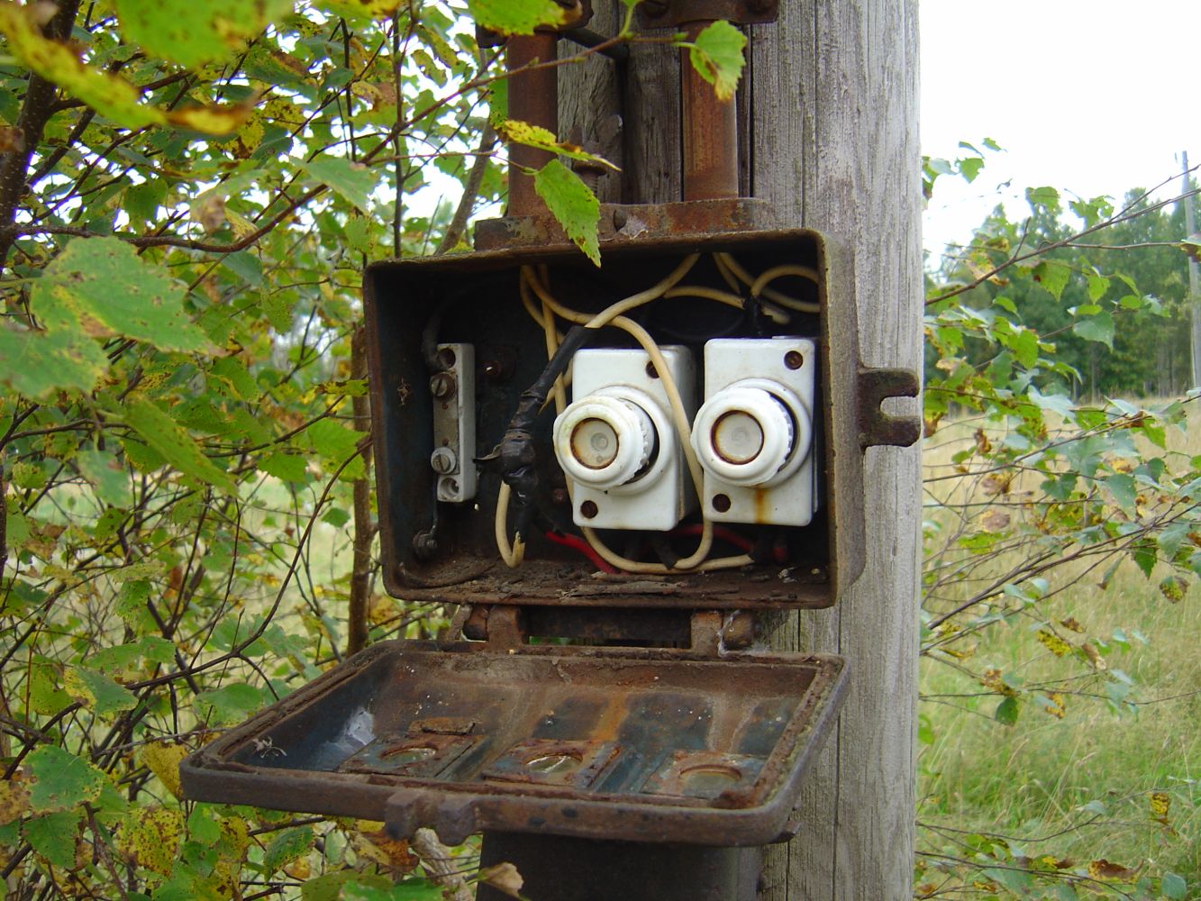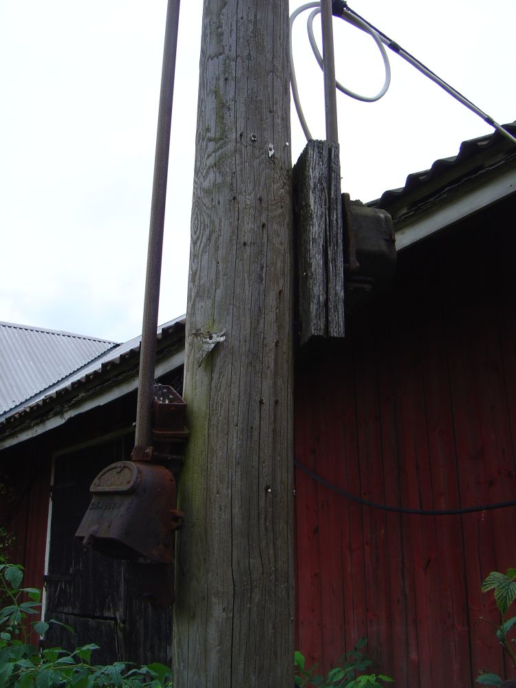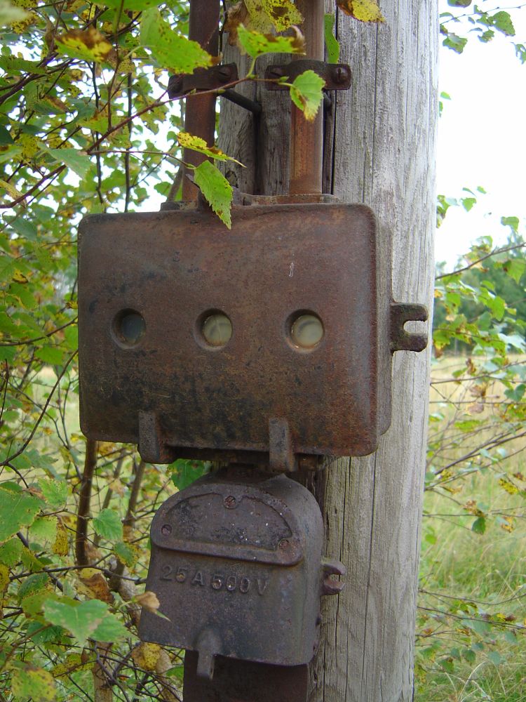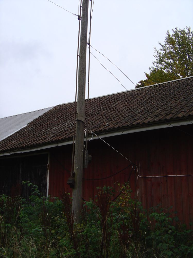 den här "öde" gården är lite märklig då det är lite förfallet och det ser inte ut att bo nån där, men det är spänning fram överallt, i alla trådar, halva ladugården har rasat ihop och där hänger avryckta spänningssatta trådar i det som en gång var taket, även 3-fasuttaget och säkringslådan på bild nedan har spänning, kollade med spänningsprovaren!