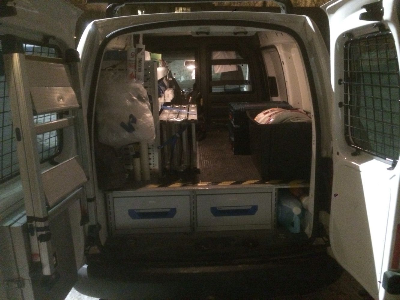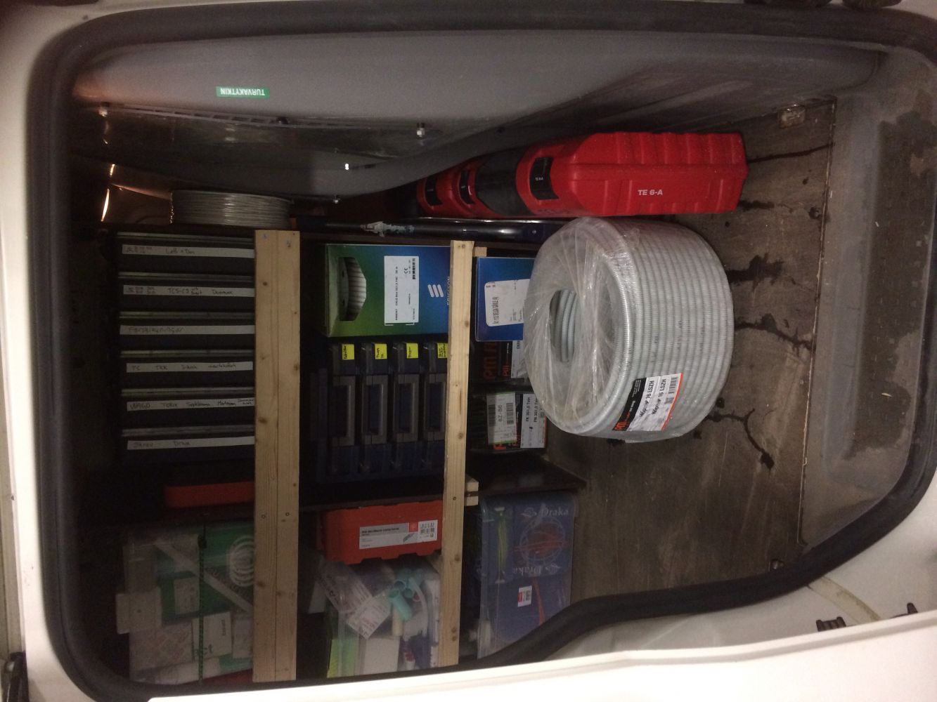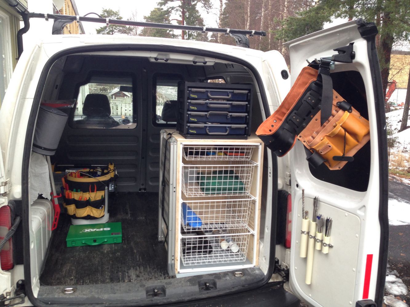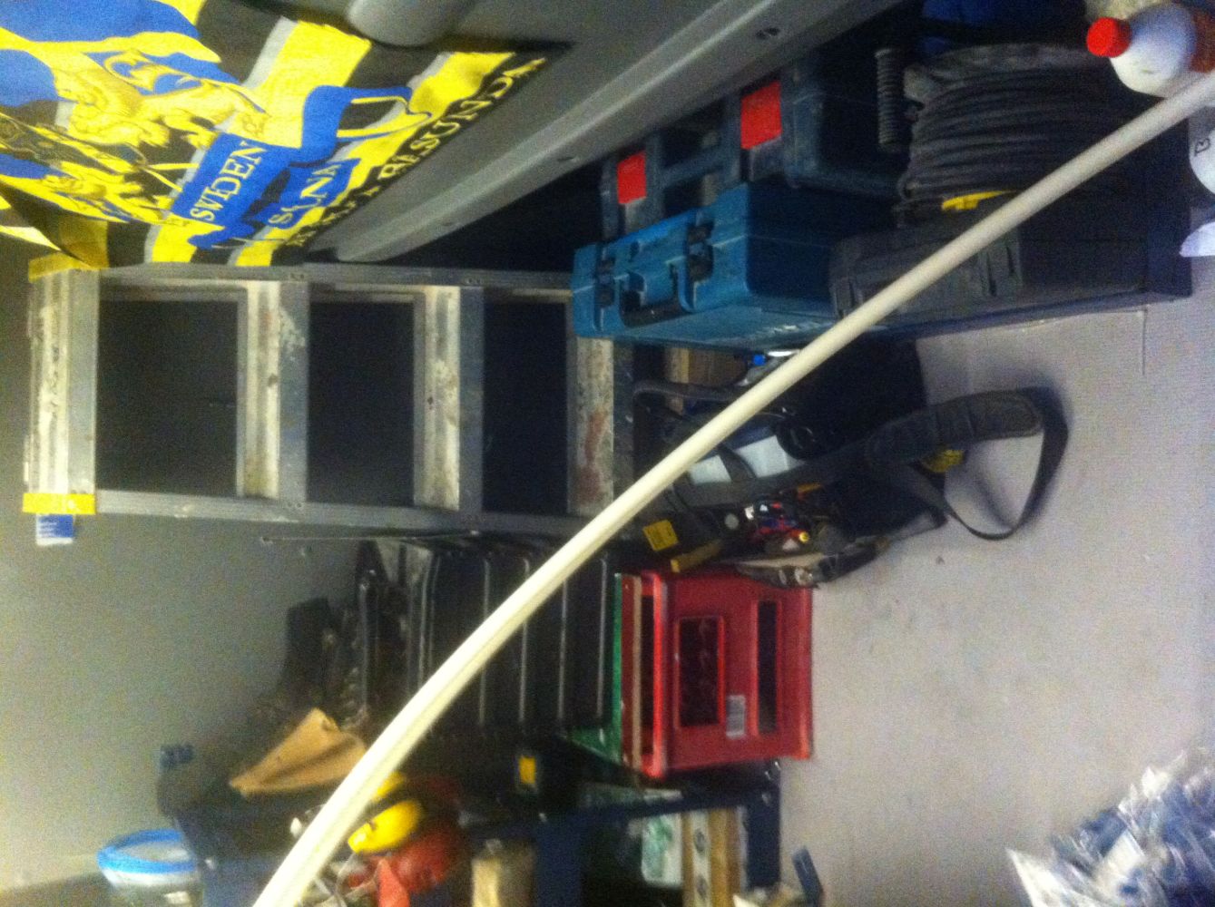 Försöker alltid ha det så tomt som möjligt på golvet om man ska lasta en massa. samt de som används mest (handverktyg, maskiner,stege, pall och handy-box) ligger längst fram