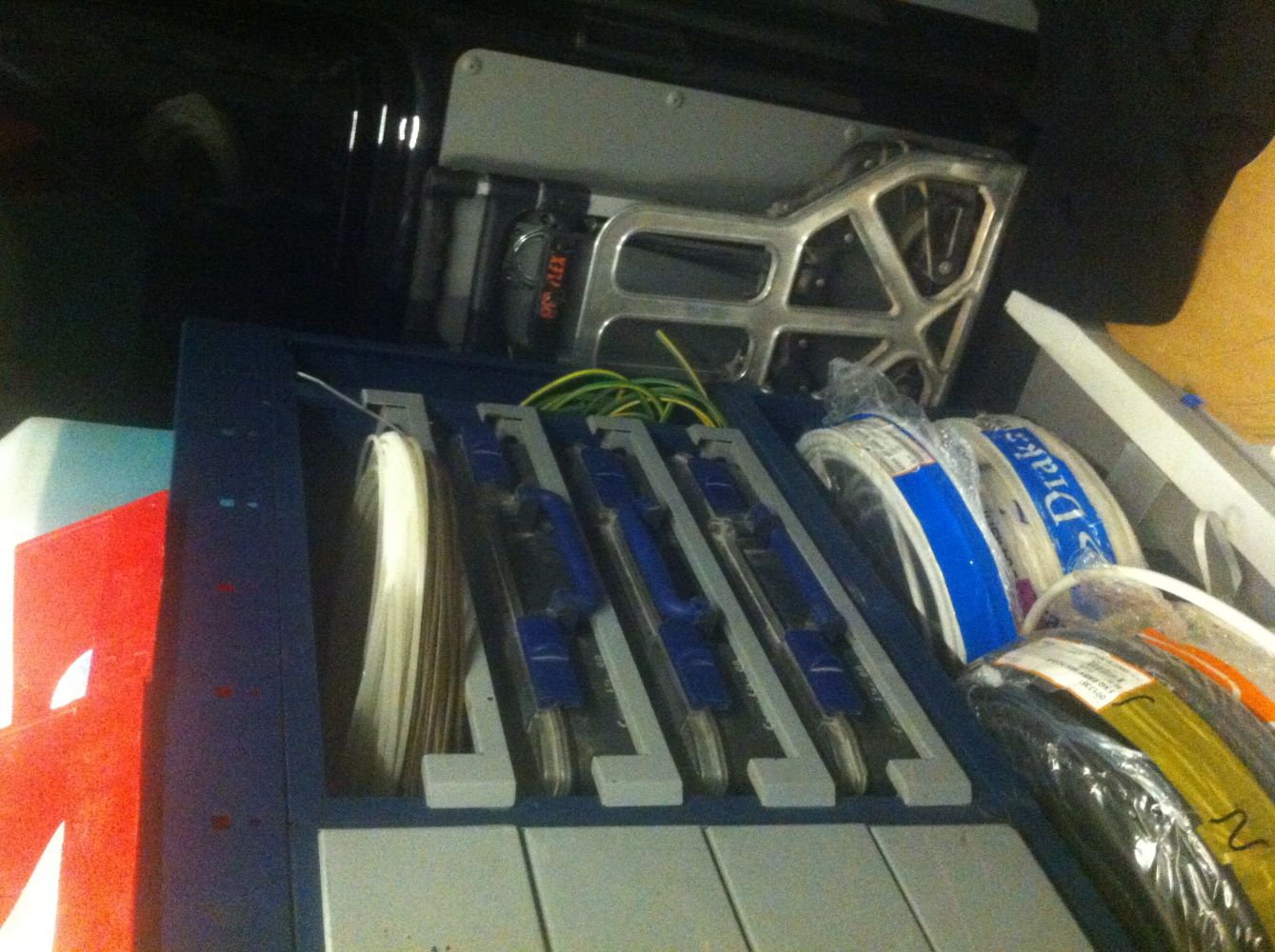 Jag har för mig att det inte brukar vara så lyckat att ha apparater med sig jämt(typ bra att ha i bilen)? Även om de är i orginalkartong så brukar de bli repiga och fula oavsett hur kort tid de varit i bilen. Det som jag tycker ha funkat bäst är att ha förslutbara "Elfa"påsar med en apparat i varje. Då kunde jag ha de länge i bilen utan skador, jag hade minimalt med reserv och försökte att få med mig det jag trodde behövdes(och lite till) och bar tillbaka in i firman efter avslutat jobb.