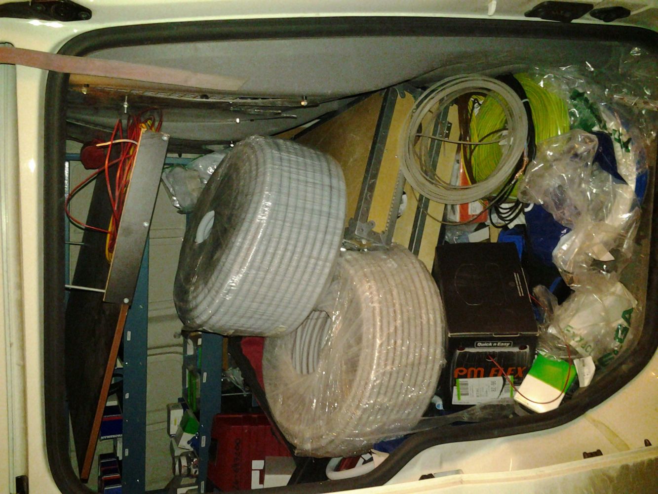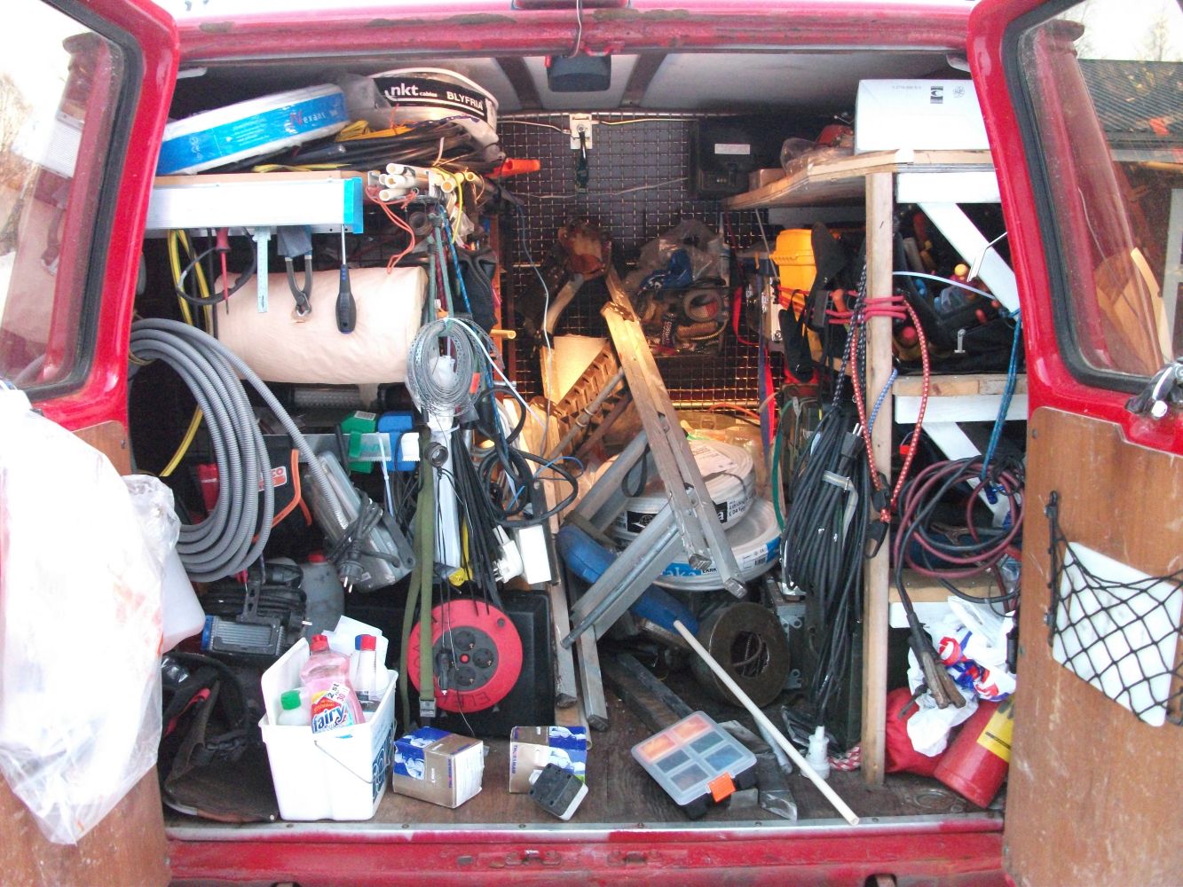 Det som inte går att böja in i bilen hamnar på takräcket. En tidigare kollega har gjort ett doshål i plasten mellan lastutrymme och "hytt" så det går att sticka in t.ex. VP rör i hela sin längd.